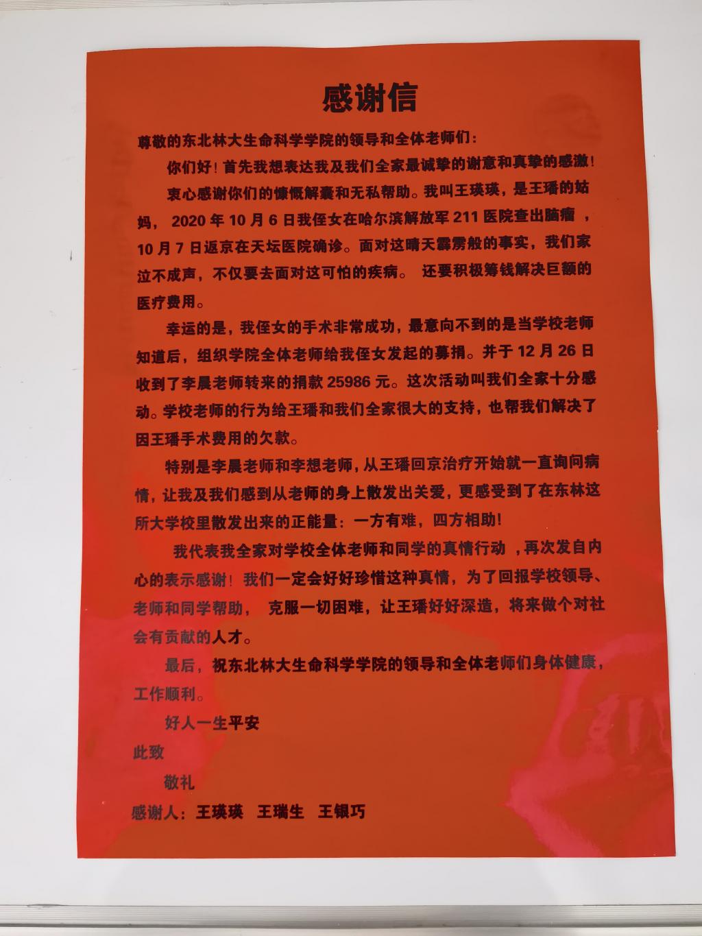 今年3月,已经康复的王璠再次返回了熟悉亲切的校园,她亲自将写满“爱生如子,厚德师恩”的锦旗和一封感谢信送到了学院领导的手里。“真的非常感谢学院领导和老师们的关心,他们的爱心让我的家人还了欠亲戚的外债,虽然我之前生病,但是去年的这个春节我们全家过的很幸福、很温暖。此生学在东林我很开心,东林这样的师恩我终身难忘。”