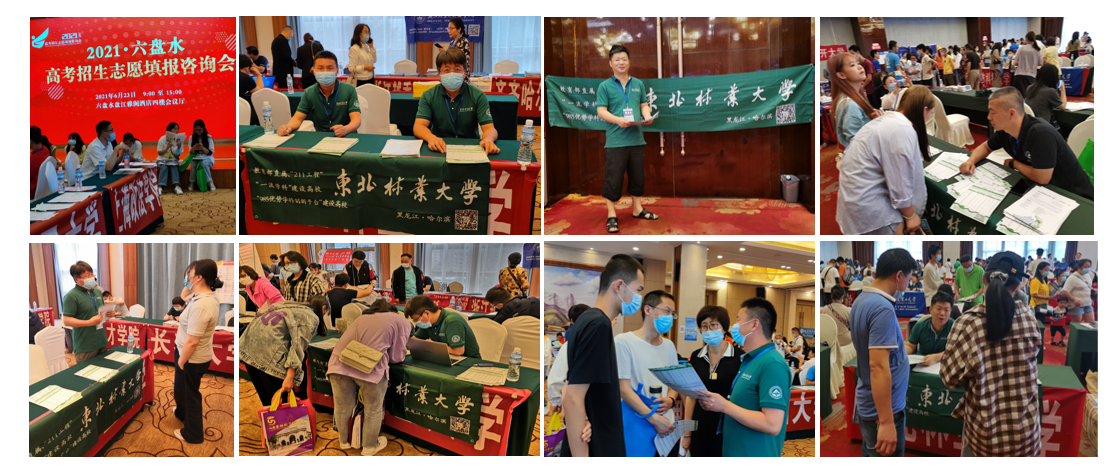 宣讲组成员在贵州省第七届普通高校招生志愿填报咨询会各会场悬挂出醒目且最具林业特色的“东北林业大学”绿色条幅,积极向考生和家长发放东北林业大学招生宣传资料,耐心细致的向他们讲解学校在本省的招生政策和专业方向,根据考生的预估成绩,分析所处的分数段位,给出合理的选报专业建议,并详细解答考生和家长所关注的生活、学费、奖学金、转专业、考研以及就业等问题。