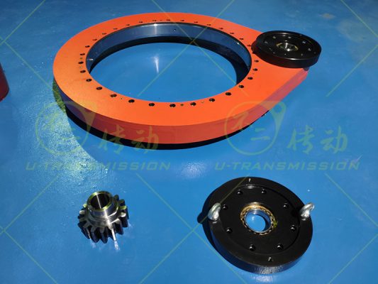 直齿驱动内部的回转支承和配套齿轮材质选用优质42CrMo锻件,经过调制229-269HB(Q+T)处理,综合机械性能大幅提高,保证客户设备提供强有力支撑,保证设备良好运转。齿均进行感应淬火,齿面硬度50HRC,齿内部柔软,齿表面淬火提高了单齿承载能力和齿的耐磨性能,心部柔软确保了齿在冲击载荷下的韧性,回转支承和齿轮的齿坚固耐用耐冲击是保证齿轮式回转驱动运行可靠、长寿命的前提。