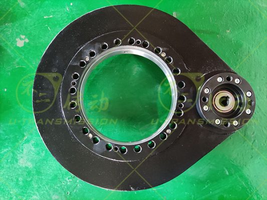 根据上述工况回转支承按照大倾覆力矩设计,采用小游隙高精度设计,确保高转速下回转驱动旋转平稳,齿采用表面感应淬火,保证大的输出扭矩及耐磨性能,齿芯部柔软,具有很好的耐冲击性,适合大惯量,大冲击载荷。壳体采用球墨铸铁QT450-10铸造而成,机械性能优良,稳定性高,耐磨抗震,壳体表面喷塑处理,防锈美观,喷塑前进行磷化处理,提高防锈能力及喷塑的附着力。输入端法兰按照客户马达输出端尺寸设计制造,客户可以直接连接马达,给客户提供很大的便利,减少连接部件,增加稳定性,节约空间,缩小整机体积,降低陈本。