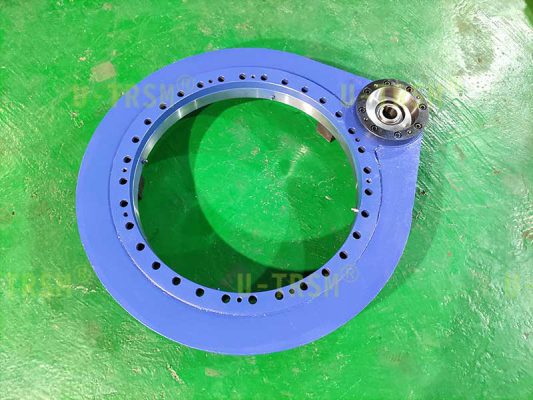 S-II-O-0541直齿回转驱动应用在工业自动化转台上,是水平安装使用。II系列回转驱动采用模数6的齿,回转支承的厚度比I系列厚,因此回转驱动的抗倾覆和稳定性提高很多。模数6的齿单齿承载比模数4大,所以II系列的输出扭矩更大,抗冲击性更好。