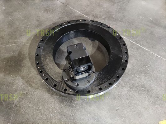 S-II-I-0541内齿精密适配90°减速机的回转驱动应用在自动化设备精密转台下面,行星减速机和伺服电机可以安装在底座内部,节约外部空间。底座高度不能过高,伺服电机不能直接连接行星减速机,选择直角减速机将伺服电机的安装方向变成水平方向。这样设计客户设备整体美观,布局合理,安装维修方便。