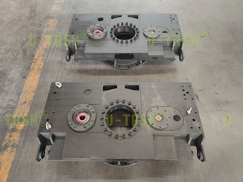 此款回转驱动应用在自动化旋转平台设备中,两侧支臂孔与平台孔成角度,用于连接举升设备使用,此驱动与平台集成一体化设计,节省设备安装空间,避免过多的安装配合造成的误差累计增加。